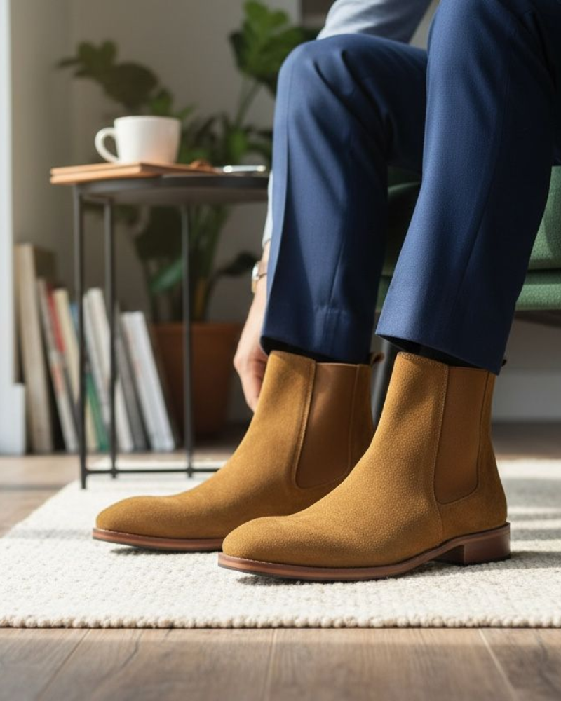 Step into timeless elegance with Regal Camel Suede Cuban Heel Chelsea Boot Designed with a sleek silhouette Tunit (sheet) sole and premium craftsmanship, celebrity choice boot offer a perfect balance of sophistication and comfort. Ideal for Regular wear, Commercial meetings, and Special occasions, they deliver a sharp look with effortless convenience.