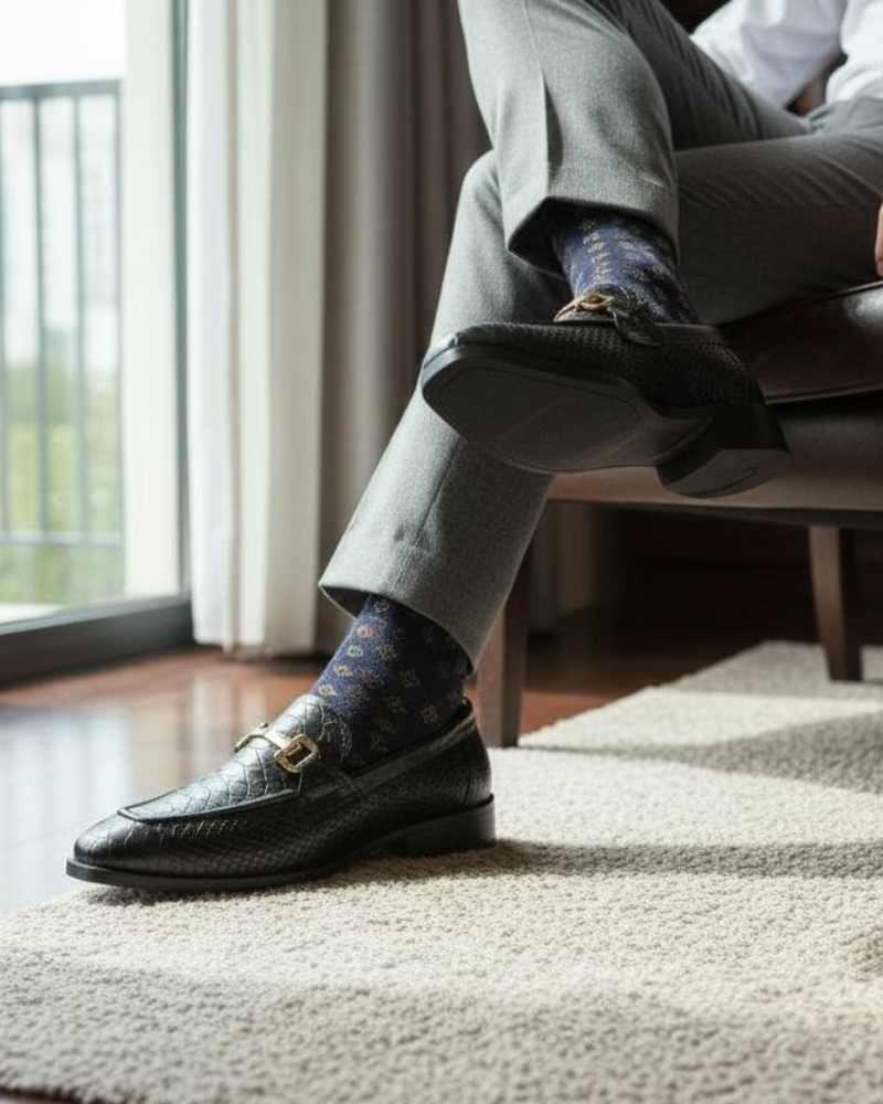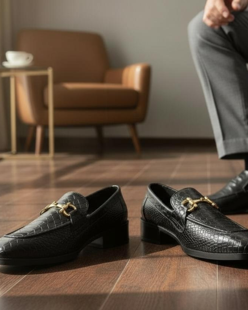The vamp’s elegant gold buckle adds a touch of subtle luxury. The elegant shape and stitched sole guarantee adaptability, from suited formals to sophisticated evening wear, while the smooth leather lining and cushioned insole inside provide long-lasting comfort.
